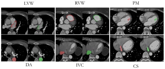 Furthermore, structure-wise, commonly observed are the whole heart and its main substructures, such as left ventricle (LV), right ventricle (RV), left atrium (LA), right atrium (RA), pulmonary artery (PA), descending aorta (DA), and coronary arteries [,]. However, the coronary sinus (CS), right ventricular wall (RVW), left atrial wall (LAW), superior vena cava, and inferior vena cava (SVC, IVC) are somewhat less explored structures. This is mainly due to the lack of annotated datasets. Recently, Baskaran et al. [] used the UNet architecture to segment the proximal ascending and descending aorta (PAA, DA), superior and inferior vena cavae (SVC, IVC), pulmonary artery (PA), coronary sinus (CS), right ventricular wall (RVW), and left atrial wall (LAW) and made the dataset publicly available. This dataset is used in our work.