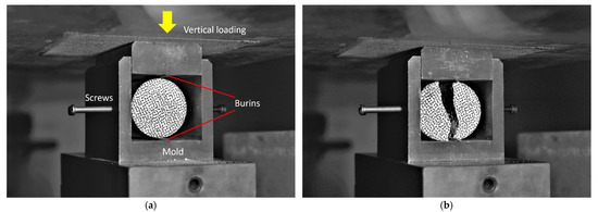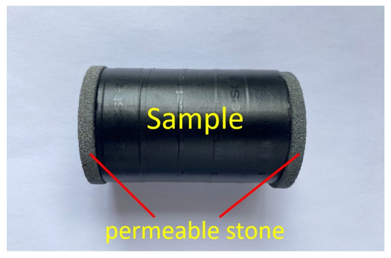 The test schemes are shown in Table 1. Each sample was used to conduct two tests: unfilled and filled with quartz sand for the consideration of the real state of fractures in practical engineering [61,62]. For the filled cases, the diameters of the quartz sand were 50 mesh, 100 mesh, and 200 mesh, respectively. In order to ensure that the same filling quality was used under each operating condition, 0.3 g of each filling material was weighed accurately. Then, the filling material was evenly placed on the fracture surface by hand or using a small brush. The sample was weighed pre- and post- filling to ensure that no filling material was lost during the process and that the filling amount was the same under each condition. Care was taken to ensure that the fillings were laid evenly on the fracture surface. The sample was wrapped with adhesive tape to prevent the leakage of quartz sand during the placement process of the samples, as shown in Figure 4. During the experiments, permeable stones were placed at both ends of the sample to prevent the quartz sand from being washed away.