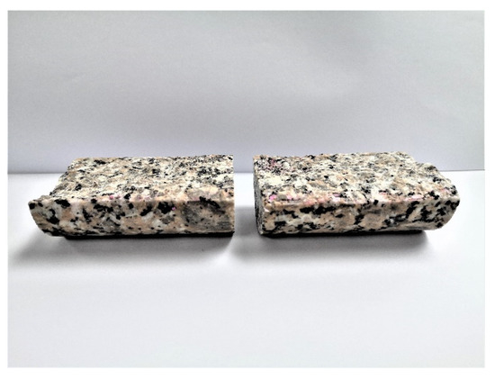 To obtain a fractured granite sample, as shown in Figure 1a, firstly, an intact sample of the size suitable for the equipment was prepared; the sample was then placed on the mold, and it was ensured that the burins on the top and bottom were in contact with the sample. Then, by applying the vertical loading after fixing the sample at the central position of the mold via the screws on both sides, it was preloaded. Next, the screws were released to allow the sample to be in an unconfined state. Finally, vertical loading continued to be applied until the sample was split into two halves, as shown in Figure 1b. The planarity after splitting was different because of the different internal mineral distribution, which resulted in different roughnesses of the fracture surface. The fractured sample is shown in Figure 2, and the three samples are named G1, G2, and G3, respectively.