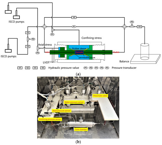 The apparatus was equipped with three independent loading systems of axial pressure, confining pressure, and osmotic pressure, all of which were controlled by ISCO pumps. Each rock sample was tightly wrapped in a rubber sleeve under confining pressure to ensure that the water only passed through the fractures in the sample. Figure 5 shows a schematic diagram of the apparatus.