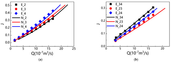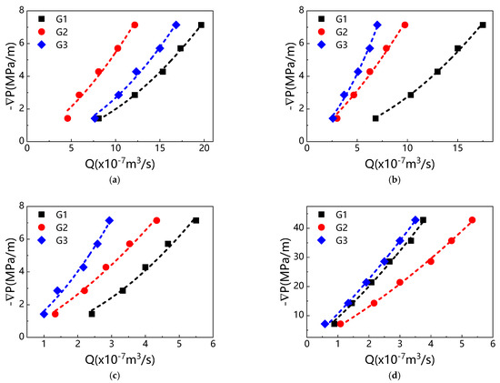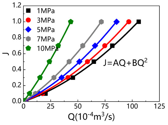 Flow experiments have been carried out for fracture samples with different filling conditions. All experimental results show that the relationship between the water pressure gradient and volume flow Q is strongly nonlinear and the Forchheimer law could describe the results well. The correlation coefficient R2 could reach more than 0.99. Figure 6 shows that an increase in flow velocity leads to a nonlinearity of flow. Non-Darcy flow is caused by non-negligible inertial damage due to a change in flow direction or velocity along the flow path, and a greater velocity results in more significant losses of inertia. A decreasing proportion in the water pressure gradient is greater than an increasing proportion of flow due to the inertial losses, and the relationship between the water pressure gradient and flow is no longer linear [1,53].