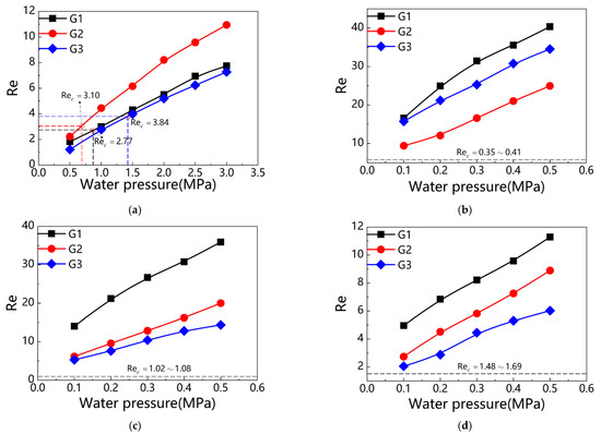 Variation curve of Reynolds number with water pressure: (a) unfilled condition, (b) filled with 50 mesh quartz sand, (c) filled with 100 mesh quartz sand, and (d) filled with 200 mesh quartz sand.