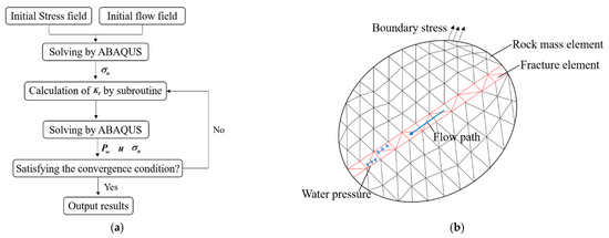 The mechanism of a hydro-mechanical coupled system is shown in Figure 8a. In the actual process of fluid flow, on the one hand, due to the change of water pressure in the fracture, the system will cause a change in the effective stress on the fracture surface (Equation (15)). On the other hand, the change in effective stress will lead to a change in the fracture aperture (Equation (7)), and the permeability also change (Equation (13)); these changes will have an effect on the flow and distribution of water pressure. The solution process is based on ABAQUS (Equation (17)).