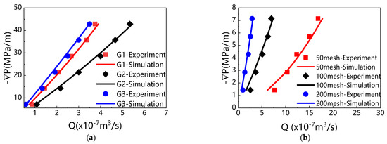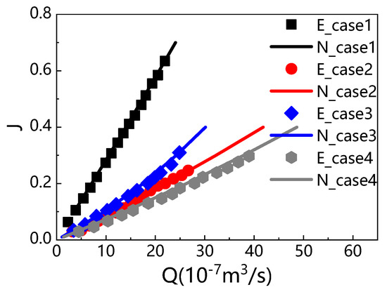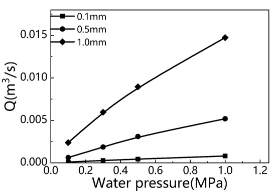 Figure 9 shows comparisons between the above experimental results of the relationship between the water pressure gradient and the flow rate with that of the numerical simulation. The results indicate high consistency for all cases. This shows that the nonlinear and hydraulic coupling effect of the fluid flow proved by the above experiments can be realized by numerical simulation.