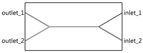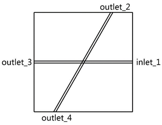 A multiple crossed fractures model is shown in Figure 12. The length and width of this model are 20 cm and 10 cm, respectively. It is composed of five fracture sections, two inlets, and two outlets. Different fracture sections have different apertures, dip angles, and lengths, as shown in Table 3. Because the model has two inlets and two outlets, different combinations can be carried out, and the four working conditions shown in Table 4 are simulated.