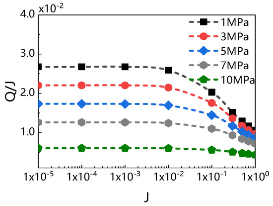 The steady-state method was selected for measuring high permeability tests. The water pressure was pumped in from the left side of the sample and flowed out from the right side of the sample after passing through the fracture. Five water pressures (0.1 MPa, 0.2 MPa, 0.3 MPa, 0.4 MPa, and 0.5 MPa) were chosen as the input pressures for the filled fractures, and another five water pressures (0.5 MPa, 1.0 MPa, 1.5 MPa, 2.0 MPa, and 2.5 MPa) were chosen as the input pressures for the unfilled fractures. The right end of a samples maintained drained conditions. The hydrostatic pressure and the confining pressure were recorded by pressure sensors, and a balance was set at the flow outlet to record the flow at any time. All tests were carried out at a constant temperature of 25 °C. The confining and axial pressures are both maintained at 5 MPa.