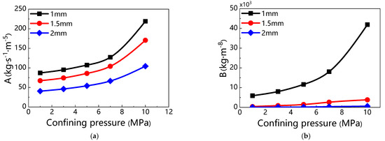 where and are the linear and nonlinear coefficients, respectively; is the dynamic viscosity coefficient of the fluid; is the Forchheimer coefficient; is the fluid density; is the width of the fracture; and is the aperture of the fracture.
