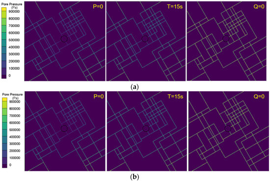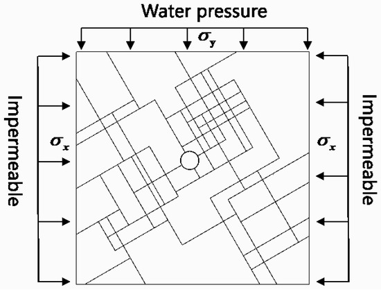 During the solution of ABAQUS, CPE6 element is used for the rock matrix, and CPE6MP element is used for the fracture as shown in Figure 8b. A subroutine is used to obtain the normal stress and flow velocity for each fracture element and to calculate the ultimate permeability coefficient . In order to solve the coupled mathematical model, ABAQUS also needs to set corresponding definite solution conditions, such as the stress boundary, displacement boundary condition, and initial head boundary.