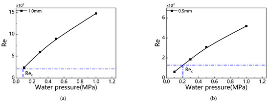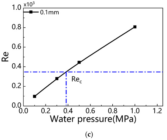 As shown in Figure 7, the Reynolds number increases with an increase in water pressure. This indicates that the inertial force is more and more obvious than the viscous force in the process of increasing water pressure. This is because the flow velocity increases gradually with the increase in water pressure, and the inertial losses caused by high velocity result in a significant nonlinearity of flow. The critical point of the flow regime transformation from linear to nonlinear can be obtained by the calculation of the critical Reynolds number. For the unfilled condition, the range of the critical Reynolds number is 2.77~3.84, and the corresponding water pressure is 0.7~1.4 MPa. However, for the conditions of filling with quartz sand, the flow regime was nonlinear when the water pressure was 0.1 MPa. This is because the larger hydraulic aperture formed by filling with quartz sand (compared with the unfilled condition), resulted in a higher flow velocity under the same water pressure, and the inertial force caused by a high flow velocity makes the flow nonlinear under a low water pressure.