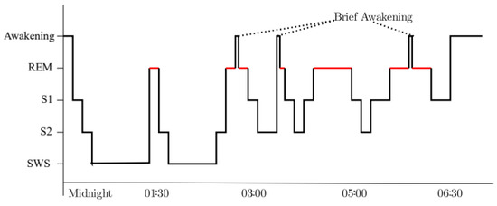 An example of a hypnogram with 6.5 h of sleep. Adapted from https://commons.wikimedia.org/wiki/File:Sleep_Hypnogram.svg (accessed on 3 January 2022).