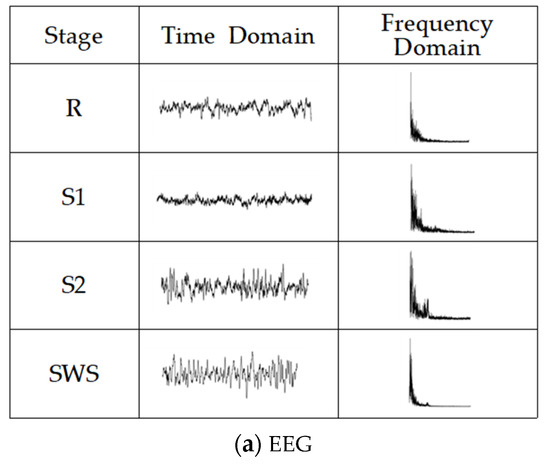 PSG signals are very complex, but they have certain important patterns for the classification of sleep stage by a somnologist. For example, wave frequencies are the important patterns used to distinguish the different sleep stages, called sleep spindles (12–14 Hz), slow waves (0.5–4 Hz), alpha waves (8–12 Hz), and theta oscillations (4–8 Hz) [5]. However, there is ambiguity in the sleep scoring manual, so automatic sleep scoring is very difficult.