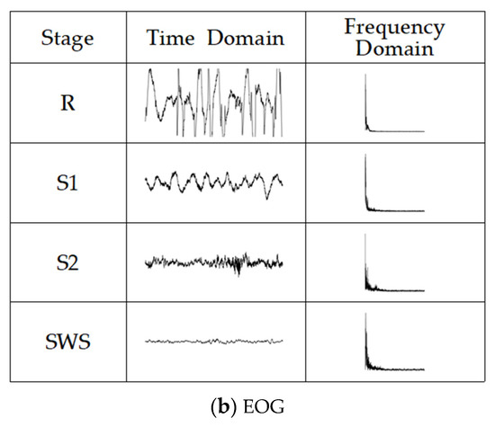 The images in the time domain and the frequency domain were converted to 2D binary images whose resolutions were 432 × 288. To minimize the computation cost, the final image resolution was set to 216 × 144, which is the size of the CNN input after resizing the image. Figure 2 shows typical sample images of the time domain and the frequency domain for each stage. The images of the EEG are in Figure 2a and the images of the EOG are in Figure 2b.