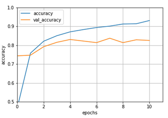 Exp1 verified the accuracy of sleep-stage classification using EEG and EOG images in the time domain as input to the CNN. After training the CNN, the accuracy of the training and validation set could be visualized. Figure 3 shows the accuracy of the training process for the numbers of epochs. After 10 epochs in the training, the CNN achieved 96% as the training set accuracy and 82% as the validation set accuracy.