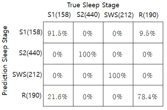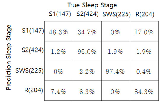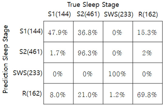 Table 2 shows the performance evaluation results of Exp1 for the testing data after training. The F1 score values were 59% for S1, 90% for S2, 100% for SWS, and 74% for R. As for the overall performance of Exp1, the weighted F1 score was 84% and the accuracy was 85%.