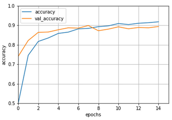 Exp2 verified the classification accuracy using EEG and EOG images in the frequency domain. Figure 5 shows the accuracy of the training process for the numbers of epochs. After 14 epochs in the training, the CNN achieves 90% as training set accuracy and 89% as validation set accuracy.