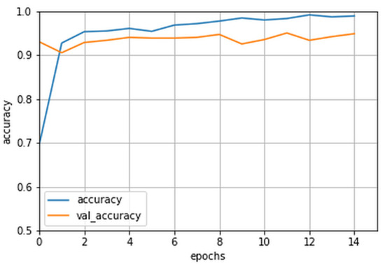 Exp3 verifies the classification accuracy using EEG and EOG images in the time and frequency domains. The input for the CNN in Exp3 was resized by concatenating the images that were used in Exp1 and Exp2. Figure 7 shows the accuracy of the experiment for numbers of epochs. After 14 epochs, the CNN achieved a 98% training set accuracy and a 94% validation set accuracy.