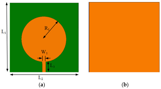Structure of the proposed circular patch antenna (a) top view (b) bottom view.