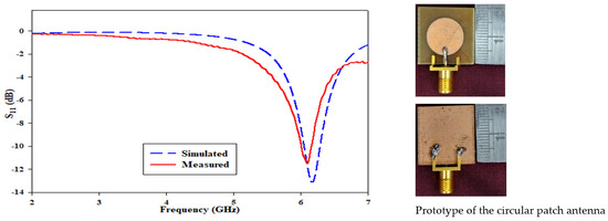 Simulated and measured return loss characteristics of the circular patch antenna.