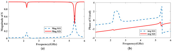 S11 and S21 (a) magnitude and (b) phase plots of the CDNG structure.