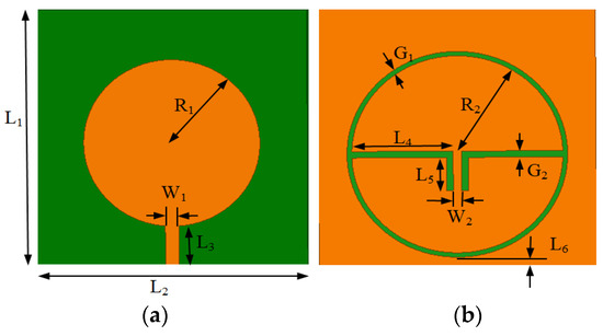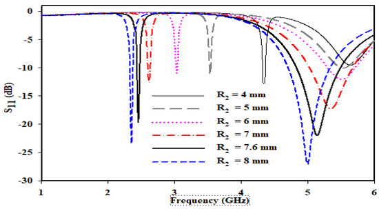 The antenna resonance for various parameter changes is analysed. The parametric analysis of various parameters is carried out using ANSYS® HFSS. It can be observed that the radius of the CDNG structure plays a major role in antenna resonance frequency. The slot length L4 = R2 − W2/2 also vary with change in radius. The radius change shifts the resonaces towards lower frequencies in two resonances. The variation in the resonant frequencies with respect to the radius of CDNG-MTM (R2), keeping all other parameters constant, is illustrated in Figure 9. The parametric analysis shown as Figure 9 points out that the shift in lower band is more significant when compared to the shift in the higher band. When R2 is varied from 4 mm to 8 mm, the −10 dB bandwidth of higher band is progressively enhanced.