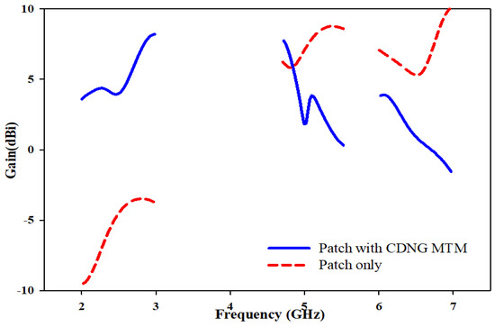 Gain plot of the proposed antenna with and without CDNG-MTM.