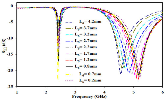 Figure 10 represents the variation in the resonant frequency with respect to slot length (L5). When L5 is varied from 1 mm to 7 mm, shift of resonances towards left is observed at both operating frequencies. The shift in lower band is more significant when compared to the shift in the higher frequency band. Lower frequency tuning up to 1.8 GHz is possible by varying L5. However, tuning of L5 is optimised at 2.8 mm corresponding to WLAN operating frequencies of 2.4 GHz in the lower band and 5.2 GHz in the higher band.