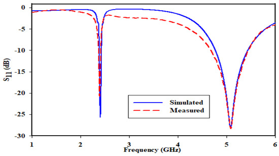 A prototype of the basic patch antenna and the proposed CDNG-MTM loaded ESA are fabricated on a low-cost FR-4 substrate with relative permittivity (εr) 4.4, loss tangent (tanδ) 0.02, and substrate height (h) 1.6 mm. The designed antenna is tested using a vector network analyser. All the simulations and optimisations are carried out using ANSYS® HFSS [38]. Even though the parametric analysis shows that the designed antenna can resonate up to 1.8 GHz in the lower band and 4.5 GHz in the higher band, the prototype is designed and tested at the resonance of 2.4 GHz and 5.2 GHz because they are the most commonly used application bands in wireless communications. All the mathematical calculations are done based on the lower resonance frequency 2.4 GHz. A photograph of the CDNG-MTM loaded ESA is shown in Figure 12. The simulated and measured return loss characteristics of the CDNG-MTM loaded ESA are shown in Figure 13. The figure shows that the ESA is operating at two bands with centre frequencies 2.43 GHz and 5.2 GHz. The percentage bandwidth of the basic patch antenna is 3.5%. CDNG loading results in antenna miniaturisation with enhanced bandwidth. The CDNG loaded ESA has a percentage bandwidth of 1.63% at 2.4 GHz and 13.15% at 5.2 GHz. It has, k = 51.47 rad/m at the first resonant frequency 2.4 GHz, a = 14.14 mm and therefore ka = 0.72 < 1. When these values are applied in Equation (6), the Qmin = 4.07 whereas the actual Q radiated (Qrad) obtained is 61.3%. Hence, by definition, the proposed antenna is electrically small [1].
