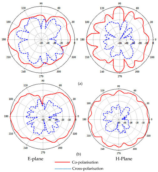 Radiation characteristics of the proposed ESA at (a) 2.4 GHz and (b) 5.2 GHz.