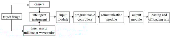 The image recognition of the flange port in the automatic docking system is aimed at the flange port at the rear of the LNG tanker docked with the bottom loading and offloading arm using a sensor combined with an infrared camera [8], a 2D laser rangefinder [9], and millimeter wave radar [10]. Multiple categories of information are transmitted in parallel to intelligent instruments consisting of computers and microcontrollers. The flange port information is then analyzed and processed by the computer to extract the spatial position and direction of the flange port, which is provided to the controller of the automatic docking system of the loading and offloading arm, and the controller sends out instructions to drive the actuator of the loading and offloading arm to realize automatic docking. The block diagram of the working principle of the system is shown in Figure 3.