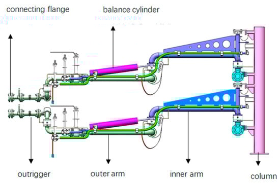 The structure of the bottom loading and offloading arm (small crane tube) is shown in Figure 4. The pipeline of the equipment is connected to the column by connecting pieces, and the upper and lower tubes are, respectively, the gas phase tube and the liquid phase tube; that is, it has a so-called dual-phase structure [11]. The loading and offloading arm is composed of a column, an inner arm, an outer arm, an outrigger arm, a connecting flange, and other components to form the main pipeline of the equipment. The outer arm is equipped with a spring cylinder balance device and is organically connected by five rotary joints to realize the 3D movement of the outrigger arm. This ensures the correct horizontal butt with the tanker flange at any position within the envelope.