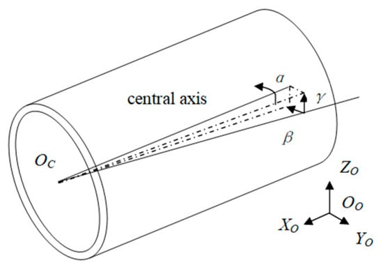 We simplified the model for the outrigger nozzle of the small crane tube to a cylinder as shown in Figure 5. The port of the small crane tube in any state can be uniquely represented by a six-dimensional vector , where , and are the center point of the nozzle end face in the calibration frame coordinate system (the actual position in the measurement coordinate system), and are the inclination angles of the axis of the small crane tube projected in the and planes, respectively, and is the rotation angle of the end face of the small crane tube with the central axis as the rotation axis. During manual docking, the central axis of the outrigger of the small crane tube is adjusted to be level with the ground, that is, is 0. The state angles of the outrigger arm of the small crane are detected by the horizontal sensor and angle sensor on the loading and offloading arm, and the position coordinates of the center point of the nozzle end face are detected by the position sensor in the actuator.