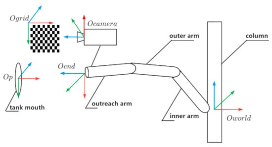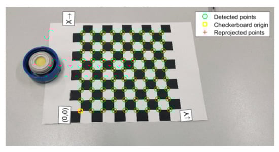 Image processing and stereo vision often involve four coordinate systems: world coordinate system, robot coordinate system, camera coordinate system, and image (pixel) coordinate system [14]. The image data of the target flange detected by the above sensors are all carried out in the image coordinate system. In order to realize the automatic docking of the loading and offloading arm, the coordinate points in the image coordinate system must be transformed into coordinate points in the world coordinate system. In this paper, the light principle was used to realize the reconstruction of 3D points from a single image; that is, the reconstruction of 3D points was realized by using the intersection of light rays and a known plane. In this paper, the Zhang calibration algorithm [15] was selected to calibrate the internal and external parameters of the camera in combination with the calibration plate. As shown in Figure 6, in one of the images used for calibration, the calibration plate was directly placed near the port of the small crane tube and the global coordinate system was established on the calibration plate.