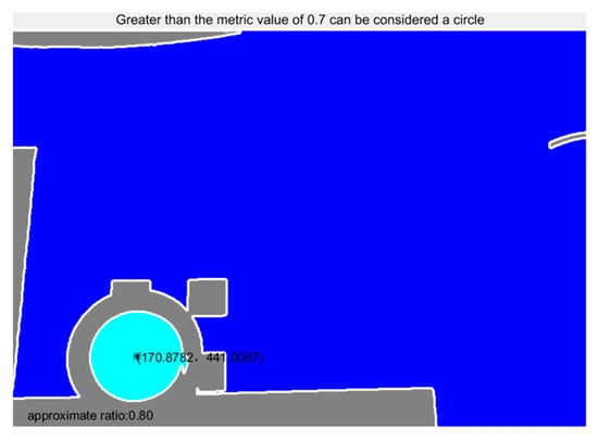 Table 1 shows the operation data of the flange end face positioning detection using the above algorithm under different working conditions, including the image resolution, the approximate ratio between the ellipses and the regular circles identified in different views, and the running time of the procedure. The approximate ratio is determined by the size of area S and perimeter L, and the approximate ratio formula is . As can be seen from Table 1, this algorithm is different from standard circle recognition for an incomplete, non-vertical angle of a spatial circle but can still accurately locate the flange end surface and center coordinates in a running time superior to the traditional HOG + SVM algorithm [20]. The data results of the HOG + SVM algorithm that are presented in Table 1 were compiled by extracting the HOG features of the single test flange. With the trained SVM classification model, the result of the single flange identification has reference values for comparison. Experimental results show that this method meets the actual requirements of the project and can locate the target flange effectively.