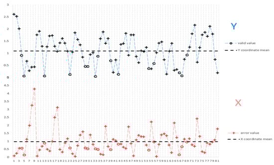On this basis, a calibrated camera is used to measure the end image of the target object. Figure 10 shows the absolute error diagram obtained using the above algorithm to locate and detect the center of the simulated flange target end face, which includes the absolute errors of the X-axis direction deviation distance and the Y-axis direction deviation distance relative to the standard image. After 81 experimental processes, a few maximum errors are removed and absolute error of X coordinate is ex = 0.97726 mm, and the absolute error of Y coordinate is ey = 1.09105 mm. In Figure 10, the X-axis represents the serial numbers of the 81 groups of circle centers. The two dot-line graphs represent the absolute error of the X and Y coordinates of the center of the circle, respectively, and each has a horizontal dashed line representing the respective error mean. Valid points are indicated by ‘o’, and error points are indicated by ‘+’. The accuracy of center positioning detection error meets the mechanical installation tolerance within the accuracy range of 3 mm. The experimental results show that this method can effectively improve the accuracy, efficiency and stability of the automatic docking system, improve the assembly consistency, and meet the requirements of automatic docking of a small crane tube.