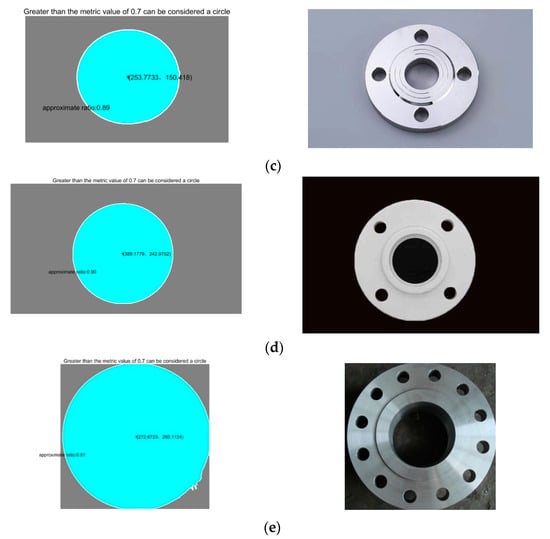 A group of flange end face images was used for our experiments, as shown in Figure 11. This image set contains five different flange images, which are, respectively, Figure 11a–e. Figure 11a represents the detection condition that is closest to the real working condition. Figure 11b represents the detection condition when the flange deviation angle is large. Figure 11c represents the detection condition with similar chromatic aberrations between the target flange and the background. Figure 11d represents the optimal working conditions—that is, the detection condition with an obvious chromatic aberration, pose position, and orientation facing the camera with no interference from ambient light. Figure 11e represents the detection of interference from ambient light to the flange surface. In the experiment, the same images were tested several times to fit the spatial circle and confirm the circle center position.