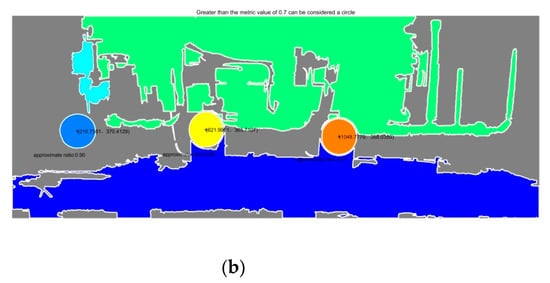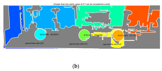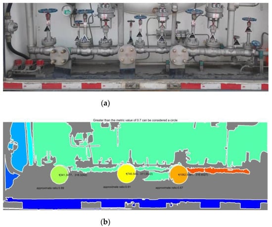 In order to verify the effectiveness of the method, this paper conducted detection experiments on multiple groups of image data. Figure 13, Figure 14 and Figure 15 show the original images of three groups of experimental images and the detection results. Taking Figure 13a as an example, with the lower left corner of the image as the origin point, the measured pixel coordinates of the flange port center are [210.74, 370.41], [621.00, 365.71], and [1048.78, 388.04], respectively. After coordinate transformation, , in which is the pixel coordinate, is the camera internal parameter, is the camera external parameter, and is the camera coordinate. The internal XOY coordinates of the world-scale camera coordinate system are [32.20, 53.61], [91.63, 55.87], and [151.80, 57.17]. The z-axis coordinates, namely the distance, are detected by other sensors.