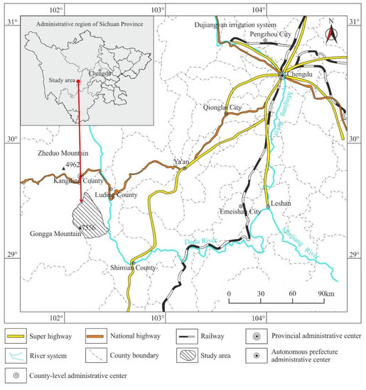 The Moxi River Basin is located in the south of the Tibetan Autonomous Prefecture of Garzê, Kangding City, Sichuan Province, which is the first-level tributary of the right bank of the Dadu River, with a drainage area of 904 km2 (Figure 1). The basin is in the topographic transition zone between the first-step terrace and the second-step terrace and at the junction of the Sichuan. The terrain is low in the middle and southeast, and high in the north, east and west sides. The west side of Moxi is alpine, while the east side is mostly sub-alpine. The highest elevation in the basin is 7556 m, the lowest is 976 m, and the difference is 6580 m.