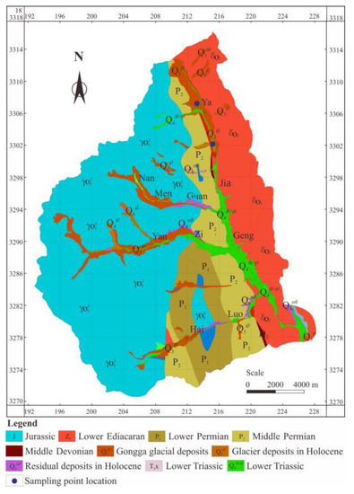 Geological disasters such as collapses, landslides and debris flows are widely developed in the basin, among which glacial debris flow is the most harmful type [5]. According to statistics, there are 51 large-scale (main ditch length > 4 km) debris flow ditches, while there are 17 glacial debris flow ditches. The glacier is active on the eastern slope of the Gongga mountain and part of the northern slope of the basin, with a glacier area of 145.34 km2 and 26 glaciers. The loose material reserves in the basin amount to 4.08 × 109 m3, of which the moraine reserves are 2.19 × 1010 m3. Sufficient water and sediments provide favorable conditions for the formation of debris flow. For this reason, it is typical and representative to choose the glacial till in this basin to carry out experimental research.