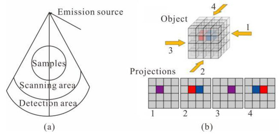 Schematic diagram of CT scanning. (a) Schematic diagram of CT scanning principle. (b) Schematic diagram of the CT scanning process.