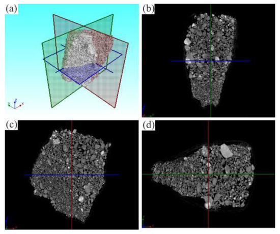 CT scanning of irregular soil sample. (a) 3D model of irregular sample. (b) X-section. (c) Y-section. (d) Z-section.