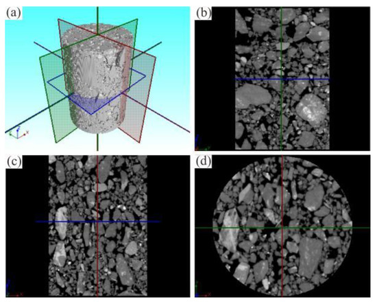 In order to avoid the distribution of the test, three soil samples were selected for CT scanning at the same sampling point and the images with large differences were eliminated; then, one of the typical soil samples was selected. In order to reflect the meso-structural characteristics of the intact glacial till, CT scanning of the irregular glacial till samples was first performed to obtain the meso-structure images of the original glacial till. At the same time, three-dimensional reconstruction was performed to restore the original appearance of the glacial till (Figure 8). The image processing system of the CT machine was used to intercept the standard cylinder with a diameter of 20 mm and height of 30 mm for analysis (Figure 9). At the same time, the coordinate system was established during the scanning process. The direction parallel to the transverse section of the sample was the Z axis direction. The directions parallel to the longitudinal-section were the X and Y axis directions. The sections parallel to the X, Y, and Z axis directions were the X section, Y section, Z section, respectively.