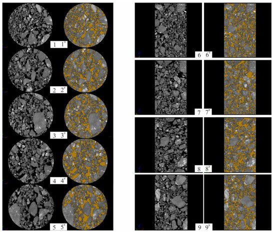 In order to analyze the meso-structure characteristics of the glacial till samples, transverse-section images at different heights of 0 mm, 7.5 mm, 15 mm, 22.5 mm, and 30 mm were selected in sequence; they were recorded as 1–5 and the corresponding rendered. The image was recorded as 1#–5# (Figure 10). The sectional images were selected at different angles of 0°, 45°, 90°, and 135° for the longitudinal section, which were recorded as 6–9, and the corresponding rendered image was recorded as 6#–9# (Figure 10). At the same time, in order to facilitate the extraction and statistical analysis of image information, the images were rendered with the supporting software of the CT machine, in which the yellow part is the pore and the gray part is the particle.
