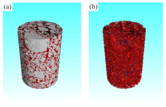 The spatial distribution of pores in the sample. (a) Pores distribution of original sample. (b) Pores distribution of sample after particles removal.