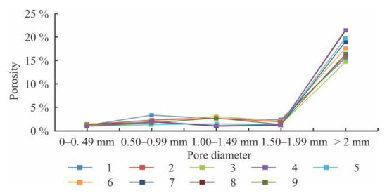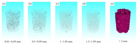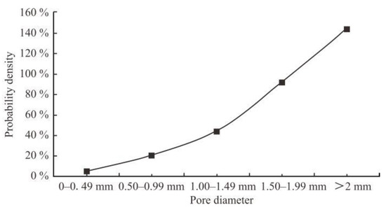The pores of the soil are used as seepage channel. The size, shape and connectivity of the pores directly affect the permeability of the soil which, in turn, affects the physical and mechanical properties and engineering characteristics of the soil. For this reason, the CT data analysis software VG STUDIO MAX was used to calculate the surface porosity and volume porosity of the soil samples. VG STUDIO MAX software can realize the three-dimensional visualization of the pores in the soil samples and adjust the transparency, so that the spatial distribution of the pores in the soil samples can be visualized. The overall pore space distribution of the glacial till sample is shown in Figure 11. The red part in the figure is the pore. In addition, according to five gradients of 0–0.49 mm, 0.50–0.99 mm, 1.00–1.49 mm, 1.50–1.99 mm and >2 mm, the pore size ratio of each section and the probability density of voids were counted. The spatial distribution is shown in Figure 12, and the statistical results are shown in Figure 13, Figure 14 and Figure 15.