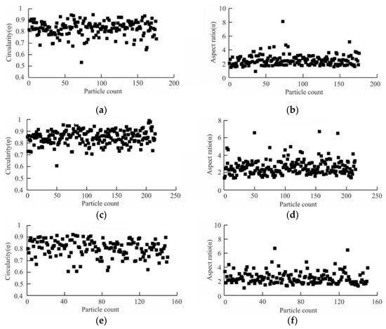 - The average circularity of the particles in the longitudinal and transverse sections is 0.836 and 0.802 and the average aspect ratios are 2.5 and 3.7, respectively. The shape of the particles in the longitudinal section is more circular than that in the transverse sections. The orientation of the particles in the transverse section direction is more obvious.