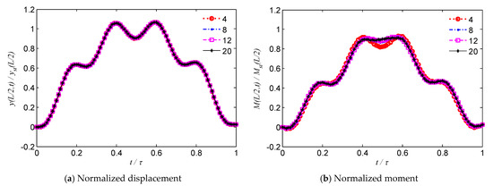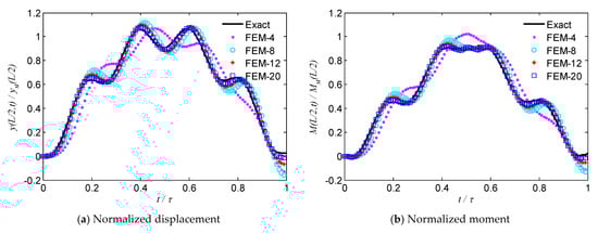 The numerical results of the normalized mid-span displacement and moment of the beam with b = 0.03 and c = 0.11 discretized into different numbers of elements are plotted in Figure 4. It can be seen that when the number of elements is 20, the numerical results of displacement and bending moment are in good agreement with the analytical results. Therefore, in the following finite element analysis, the beam is discretized into an even number of elements and at least 20.