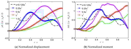 Figure 5 shows the numerical results of the normalized mid-span deflections and bending moments for various moving speeds of the load. As stated earlier, the critical speed is used as a reference [7,17,34,35,39,40,41]. Note that for the SIBT model, the fundamental frequency is defined by Equation (17), which is different from . With b = 0.03, one can easily obtain the critical speed parameter = 0.998. This means that the velocity of the moving load is just equal to and that the ratio between the moving time of the load on the beam and the fundamental period is 0.5. Five moving speeds are considered here, namely, c = 0.125, 0.25, 0.5, and 1.5. For , as the c increases, the beam displacement response deviates further from the static one. The maximum normalized mid-span displacements are 1.139, 1.269 and 1.710 for c = 0.125, 0.25 and 0.5 respectively. For , the beam displacement response reaches the maximum when the moving load leaves the beam (), and the corresponding maximum displacement amplification factor is 1.554. For , the mid-span displacement increases monotonously with the marching time, and the maximum displacement amplification factor is 1.008. In this case, the maximum response occurs after the moving load has passed the beam, similar to an impact problem [7]. This phenomenon is related to the speed of the waves in the beam. As for the bending moment, the maximum normalized mid-span moment is less than the maximum normalized mid-span displacement. However, the bending moment histories are more irregular.