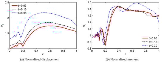 To further visualize the dynamic character of the beam under the moving load with different speeds, the dynamic magnification factors are carefully presented for the whole range and different cross-sections b = 0.03, 0.15 and 0.30, in Figure 6. The dynamic magnification factors of mid-span displacement and mid-span moment are defined as and , respectively. We can clearly see that with the increase in the moving speed of the load, the displacement amplification factor changes nonlinearly, which is associated with the oscillations discussed in Figure 5. In addition, with the increase in the cross-section size of the beam, the displacement amplification factor has a tendency of constant amplification. This phenomenon can be attributed to the increasing influence of the shear effect of the SIBT beam. Compared to the displacement magnification factors , we can note that the moment factors are more irregular; is smaller than for all c; and is even less than unity for certain c values. Taking b = 0.03 for an example, the main increases in the factors and occur only in the intervals and , respectively. The max () = 1.738 for c = 0.62 and max () = 1.437 for c = 0.38. For lower values of the ratio c, that is , the magnification factors in Figure 6 both increase and decrease with increasing c. For higher c values, and respectively, and decrease in the present problem.
