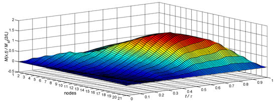 Figure 7 and Figure 8, respectively, plot the nodal time history of the normalized displacements and bending moments of a beam. For example, the beam with b = 0.03 is subjected to a moving load with c = 0.50. The maximum displacement of the beam is found to be 1.71, occurring at node 11, which locates at the mid-span, and when t = 0.66. However, the maximum bending moment of the beam of 1.57 occurs at node 13, which corresponds to x = 0.6 L, and when time t = 0.61. This interesting phenomenon shows the discrepancy between the occurrences of the maximum displacement and bending moment. The reason may be related to the assumption of the SIBT, which deserves further study.
