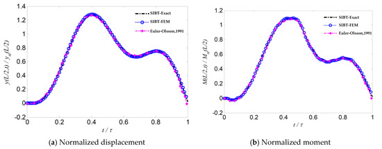 Figure 9 shows the comparison in terms of dynamic responses of the beam modeled according to the SIBT and Euler–Bernoulli with c = 0.25. It can be seen that time histories of the normalized mid-span displacement and bending moment obtained according to the SIBT model are virtually the same as those calculated by the Euler–Bernoulli model [7]. This is expected in view of the fact that the height–span ratio of the beam is 1:16, which is very small. Consequently, for a slender beam, the effect of shear deformation and shear inertia captured by the SIBT model is negligible.